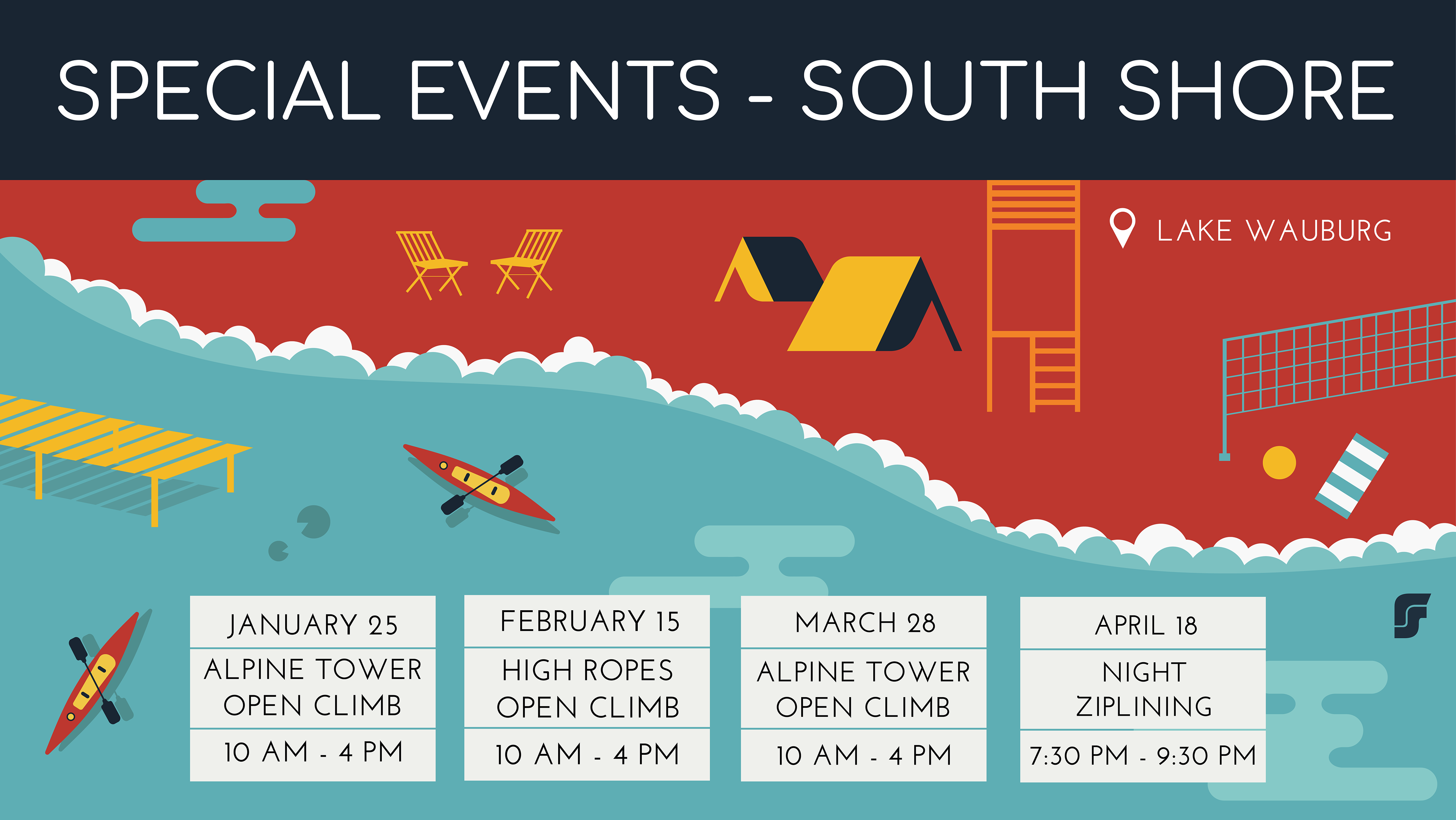Series of print materials promoting the Spring 2020 events at South Shore Lake Wauburg in Florida. Lake Wauburg is an important venue for RecSports outdoor recreation because of its nature and resources available to UF students and visitors like the climbing tower, sports fields, and biking trails. The special events offered include climbing the alpine tower and ziplining. I used Adobe Illustrator to create all promotional materials.